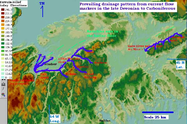 Field mapping and sample analysis of the area tens of kilometers to the north and northeast of exposed Horton formation from where the claim blocks were subsequently staked revealed data that pointed to the current source directions of the sediments placed on the Avonport Peninsula. A combination of sedimentary and paleontological variables as