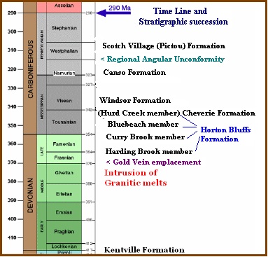 Outside of the claims within 0.5 km, along Barkhouse Creek, the White Quarry Fm. unconformably overlays the Cheverie Fm. The Cheverie Fm. unconformably covers the upper member of the Horton Bluff Fm. Where the Cheverie Fm. dips at about 5° to the east, while the Horton Bluff Fm. dips 10° to the east. The dip seems to steepen further to the northwest along the creek bed, as the section ages into the middle member and returns to the 15° dip when the lower member is reached near the headwaters of this creek.